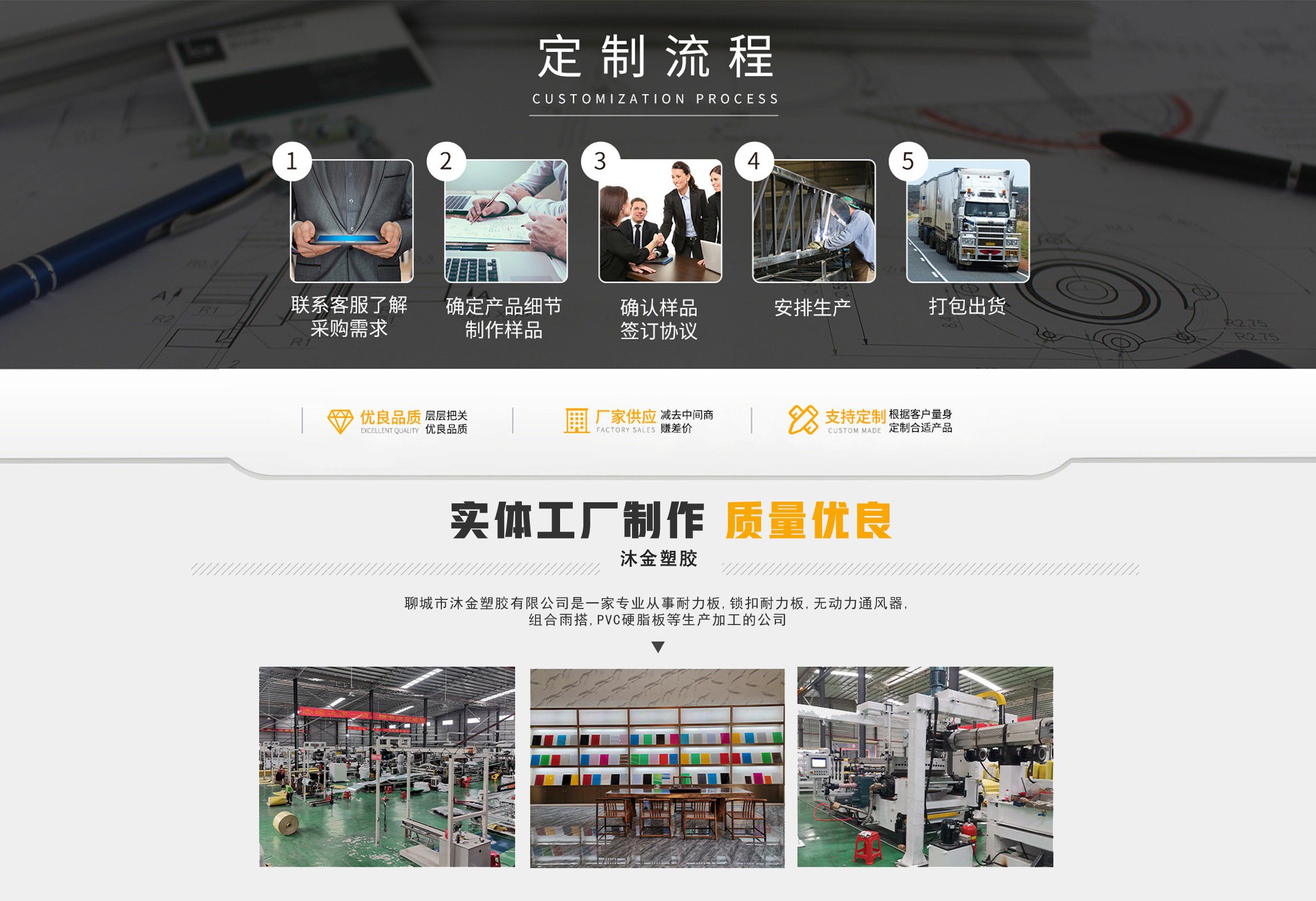 聊城市沐金塑膠有限公司注冊資金2180萬元,占地20000余平方,擁有自建廠房15000平方,員工100余名。10余年來,公司主營耐力板,鎖扣耐力板,耐力板深加工,無動力通風器,組合雨搭,PVC硬脂板,耐力板廠家等板材的發展戰略,逐漸成長為綜合性企業?! 」緭碛卸鄺l板材共擠生產線,采用世界知名品牌進口原材料和先進工藝,依據完善的ISO9001質量管理體系和ISO14001環境管理體系,為產品的卓越品質提供了強有力的保證。憑借過硬的創新能力和堅實的硬件基礎,贏創已成為國內領先的熱塑性板材生產商,產品被廣泛應用于建筑業、農業、工業、廣告業、安防行業及DIY領域?! 」臼冀K致力于通過提供最優的板材應用解決方案,為客戶創造最高的價值;堅守創新、質量、靈活、服務和速度的核心價值觀;堅持“完美的產品需要完美服務的支持”的經營理念,努力實現成為世界領先的板材與解決方案供應商的夢想。  在未來,公司將立足客戶需求,不斷改變和完善現有產品,拓展產品線和充分開發板材的應用領域,為客戶創造全方位的價值。同時更好地實現員工的價值,實現公司團隊的價值。我們將與您一起創贏未來!  企業使命:成為世界領先的板材與解決方案供應商。  公司愿景:通過提供最優的板材應用解決方案,為客戶創造最高的價值?! 『诵膬r值觀:質量...